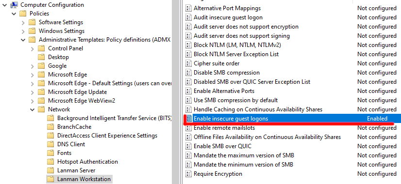 Computer configuration -> Policies -> Administrative Templates -> Network -> Lanman Workstation -> Enable insecure guest logons